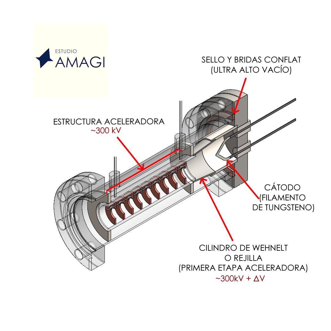 Fuente de Electrones conceptual, diseñado como estudio de Física Aplicada, alrededor de bridas tipo "Conflat" o CF, que mantienen el vacío a niveles ultra-altos (UHV o Ultra-High-Vacuum) usando un perímetro circular, muy afilado, para "morder" en gaskets o sellos de cobre suave ultra-puro.